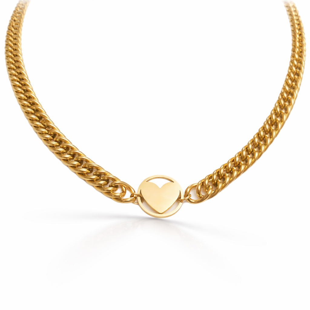 Questo gioiello è una fusione di eleganza e durata, grazie all'acciaio inossidabile placcato oro. Il cuore centrale aggiunge un tocco di romanticismo e rende questa collana perfetta per qualsiasi occasione. Puoi indossarla tenendo il cuore centrale oppure mettendolo di lato. Misura 55 cm x 8.5 mm