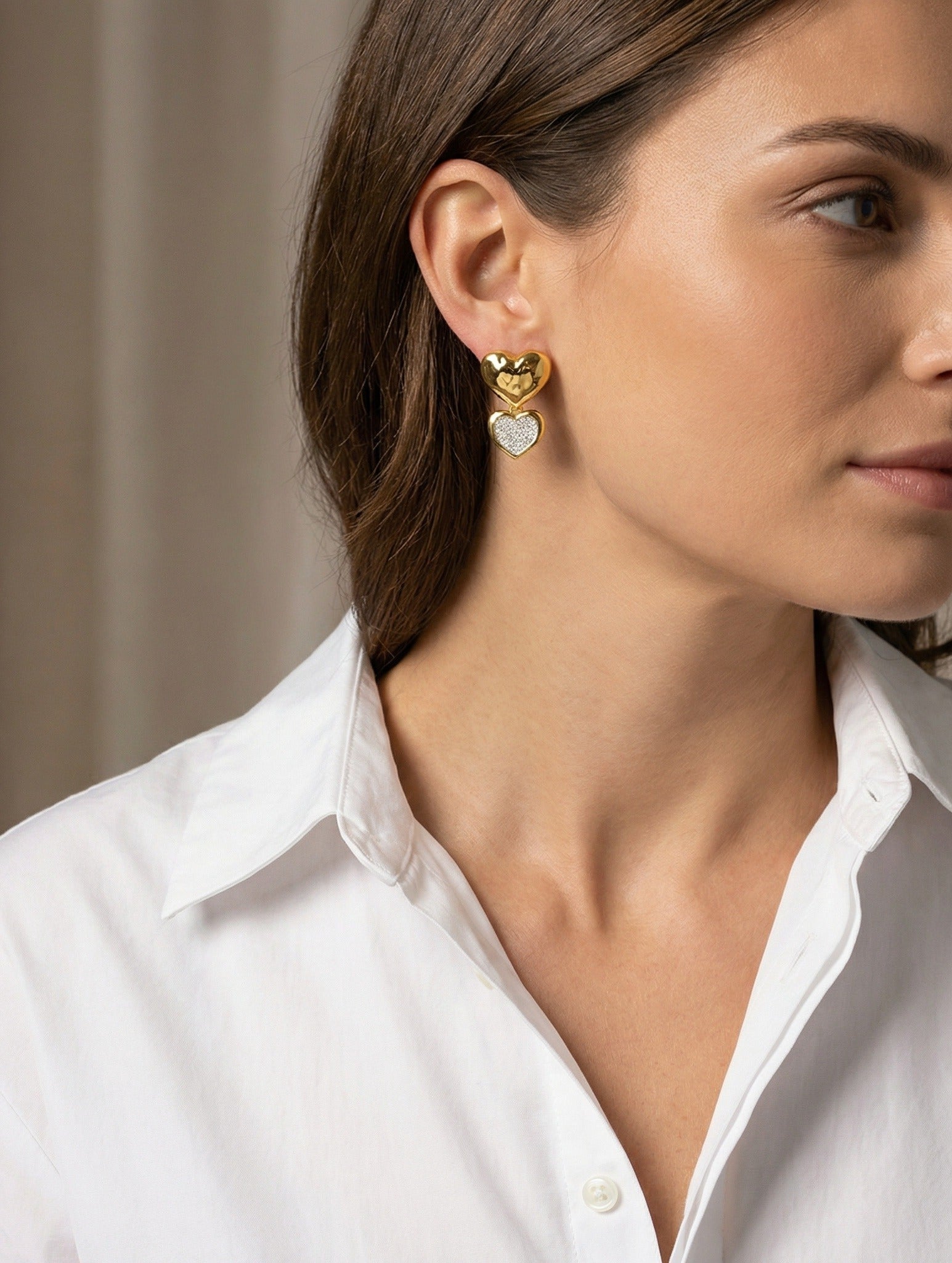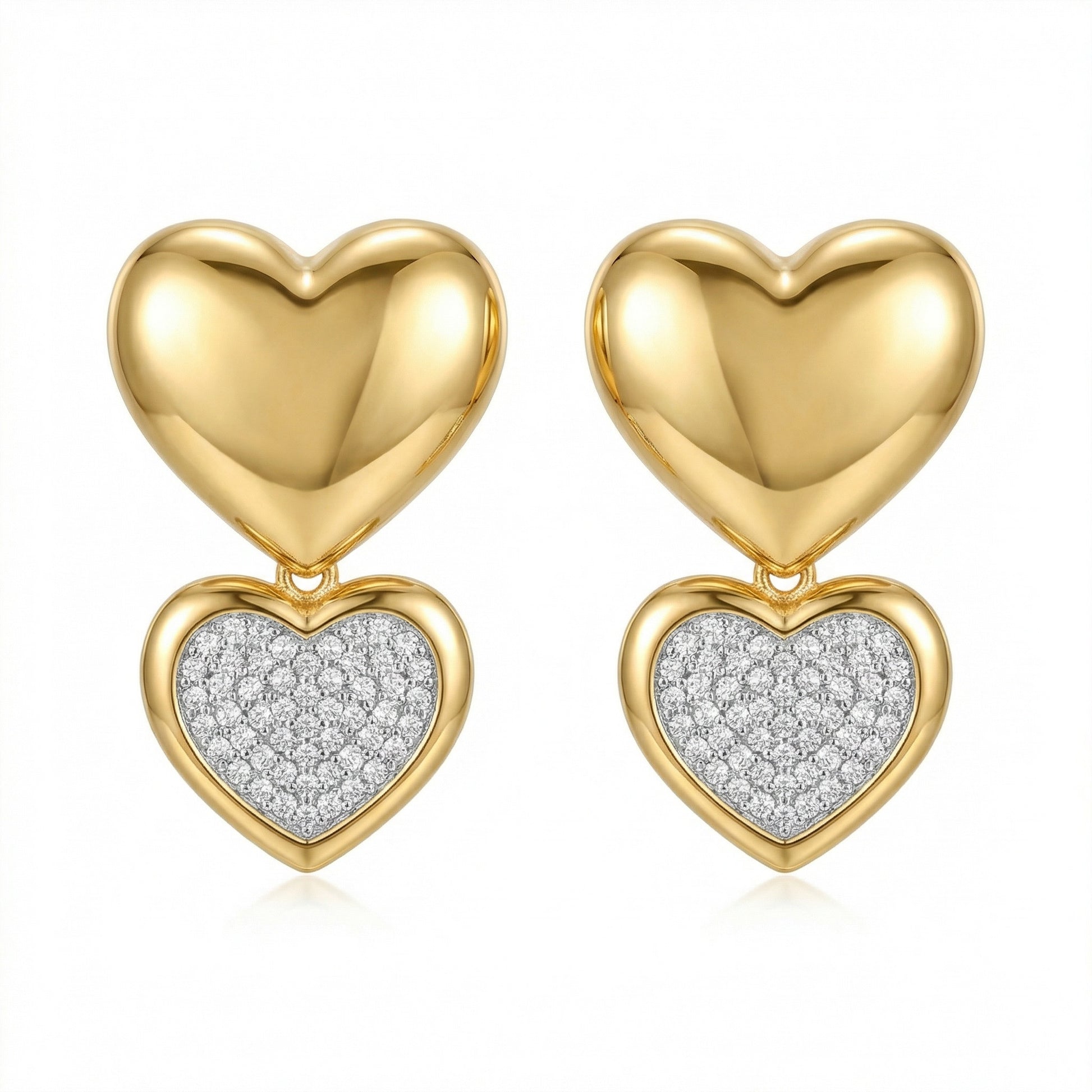 Scopri il fascino senza tempo degli Orecchini Blake, realizzati in pregiato argento 925 e impreziositi da una placcatura in oro per un tocco di eleganza raffinata. Il design unico presenta un cuore più grande dal finish dorato lucente, accompagnato da un cuore più piccolo sottostante, completamente ricoperto di scintillanti zirconi bianchi pavé.