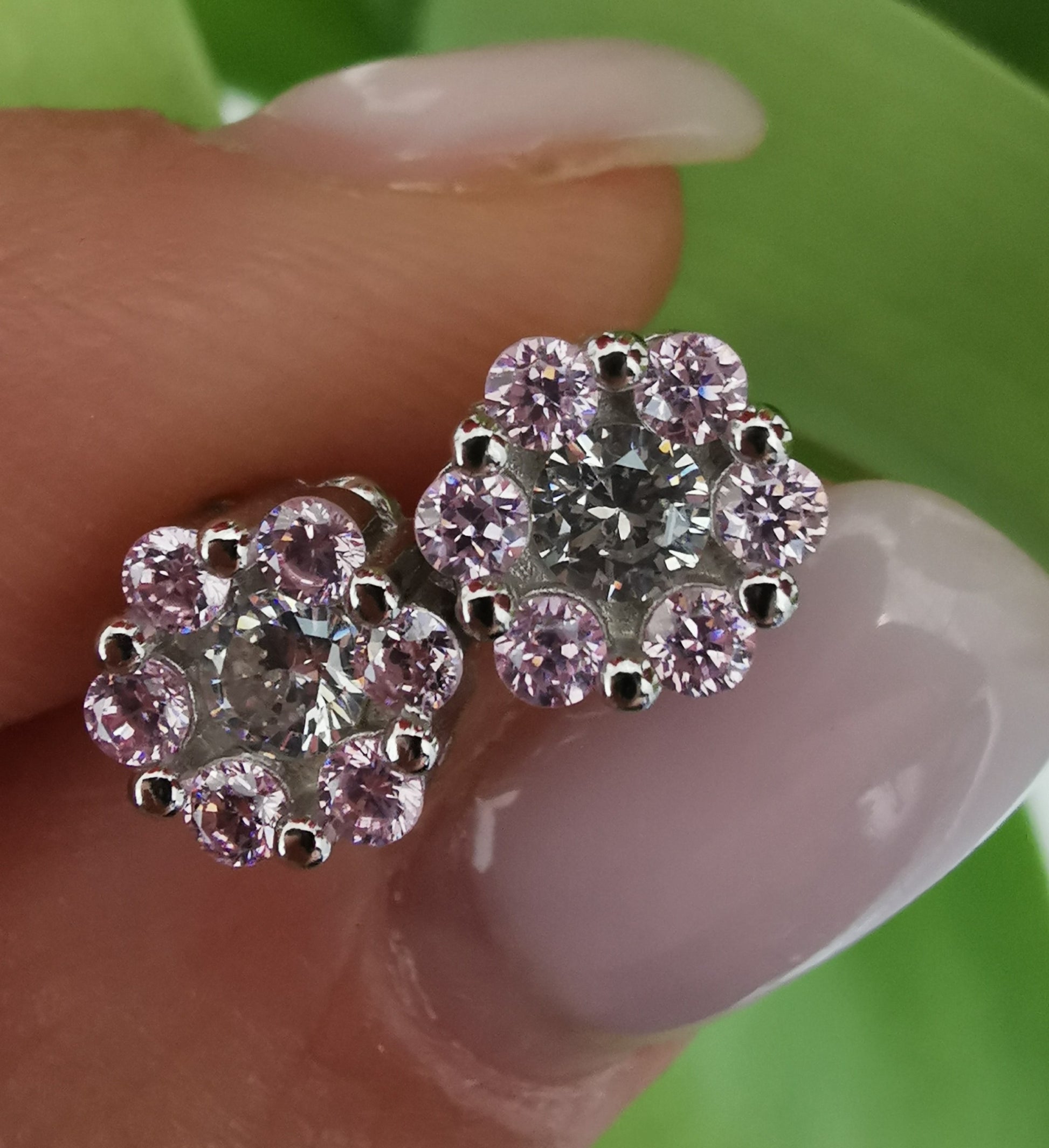 Questi eleganti orecchini presentano un design delicato a forma di fiore impreziosito da zirconi rosa che catturano la luce in modo incantevole.