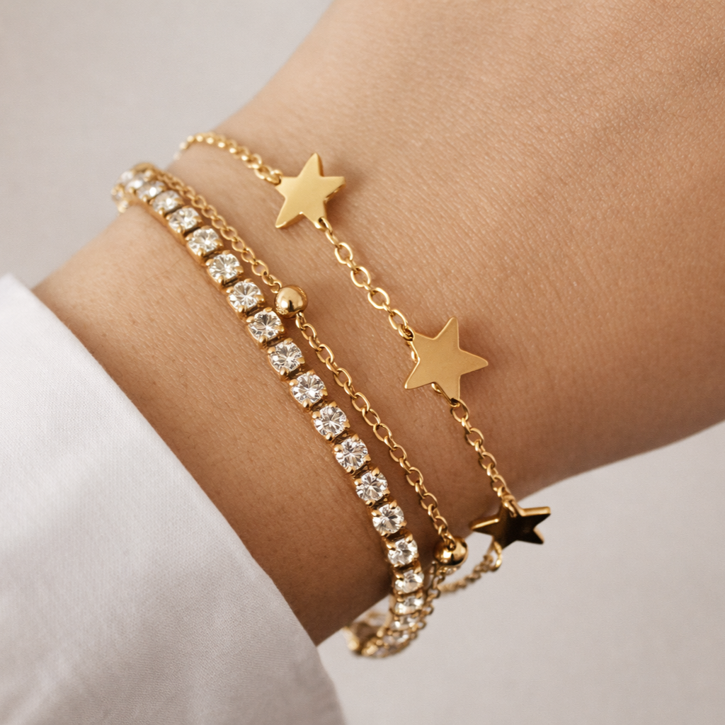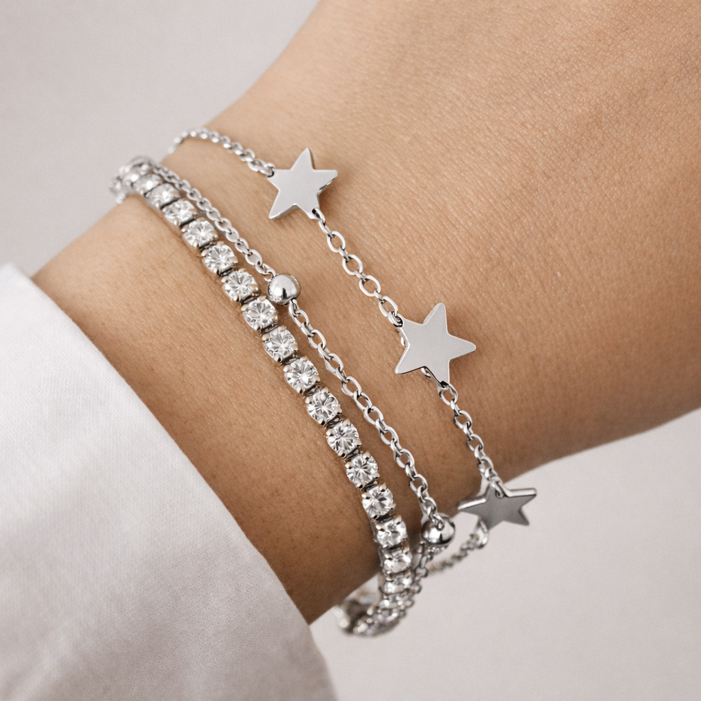 Eleva il tuo stile con il nostro bracciale in acciaio inossidabile a tre strati. Questo gioiello unisce la lucentezza dei zirconi bianchi, la raffinatezza dei pallini e la delicatezza delle stelline in un unico design affascinante. L'accessorio perfetto per aggiungere un tocco di brillantezza al tuo look quotidiano.